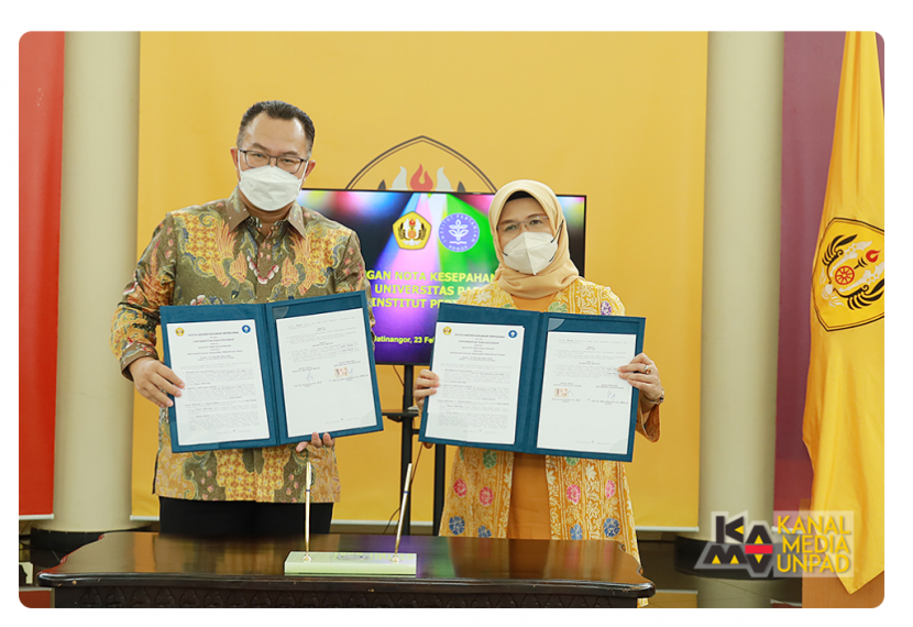 Rektor Unpad Prof. Rina Indiastuti dengan Rektor IPB Prof. Dr. Arif Satria, M.Si. menandatangani nota…