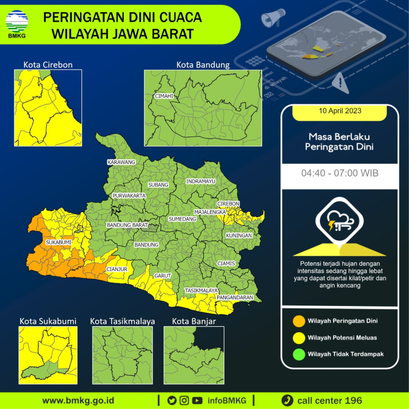 Selain itu BMKG memberi peringatan waspadai potensi hujan disertai kilat, petir dan angin kencang di siang dan malam hari di sejumlah daerah di Jabar.