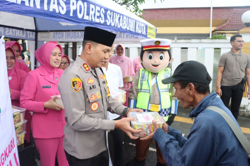 Kapolres Sukabumi Kota AKBP Ari Setyawan Wibowo membagikan sembako dan takjil di depan Mapolres Sukabumi…