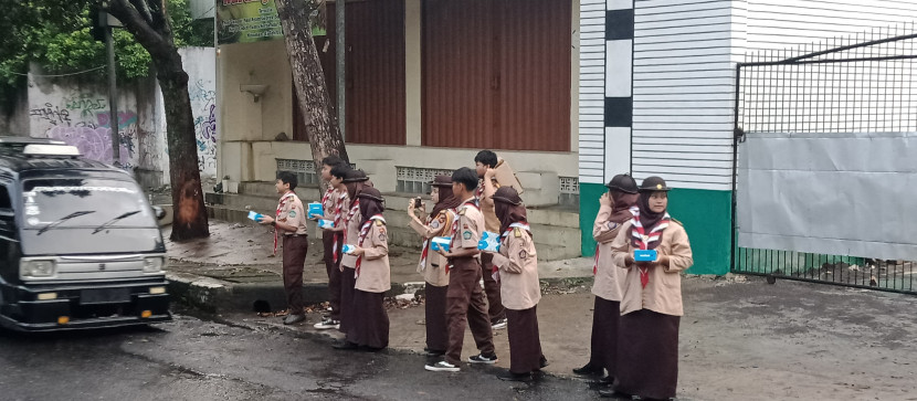Para anggota Pramuka MAN 1 Kota Sukabumi membagikan takjil dalam gerakam Rantang Pramuka di Jalan…