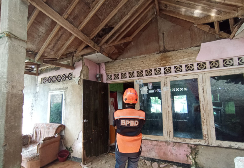 Petugas BPBD Kabupaten Sukabumi mengecek salah satu titik dampak kerusakan akibat gempa 6.5 yang berpusat…