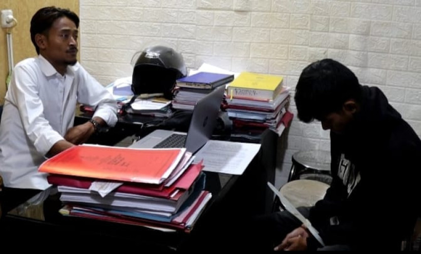Penyidik Polres Sukabumi Kota memeriksa kurir ekspedisi yang membuat laporan palsu dibegal di Mapolres Sukabumi…