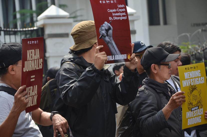 Wartawan Bandung dari berbagai organisasi menggelar aksi menolak RUU Penyiaran, di depan Gedung DPRD Jabar,…