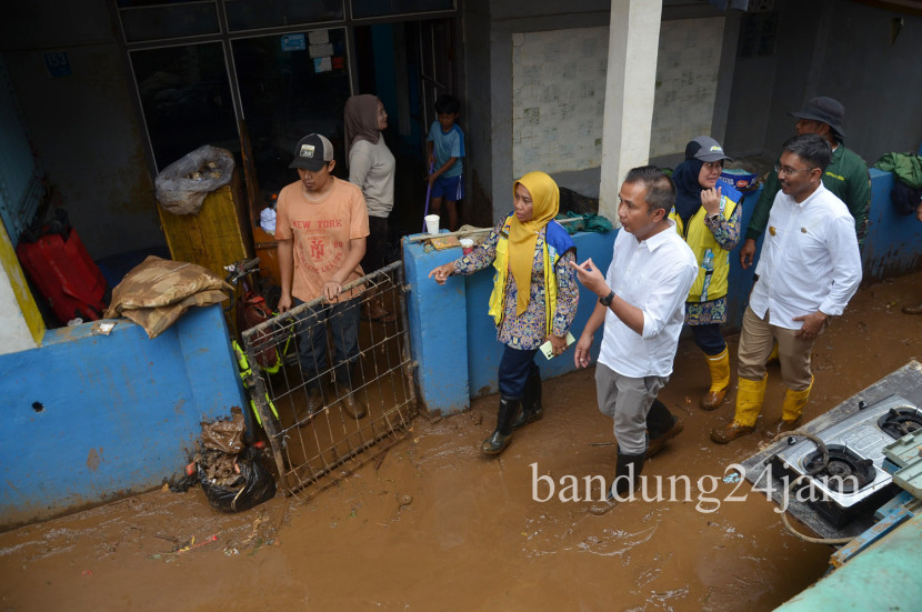Warga membersihkan rumahnya yang dipenuhi lumpur akibat banjir bandang di Desa Banjaran Wetan, Kecamatan Banjaran,…