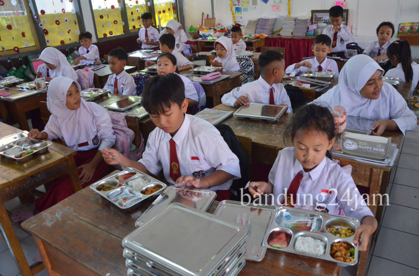 BANDUNG--Para pelajar menikmati sajian Makanan Bergizi Gratis (MGB) di SDN 193 Caringin, Sukajadi, Kota Bandung,…