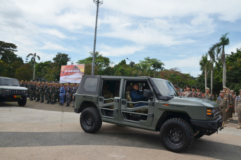 Wali Kota Bandung M Farhan melakukan pemeriksaan pasukan dengan kendaraan Maung saat Apel Gelar Pasukan…