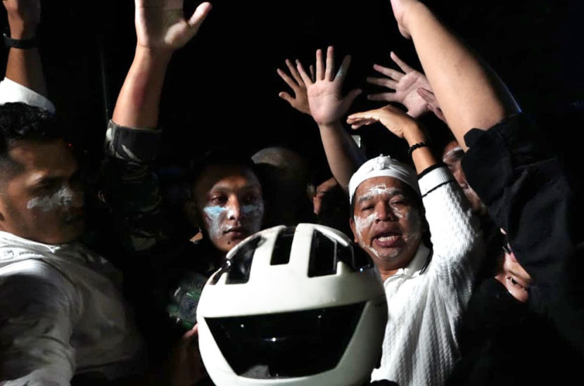 Gubernur Jawa Barat Dedi Mulyadi menemui massa aksi, saat aksi besar-besaran di halaman DPRD Jabar,…