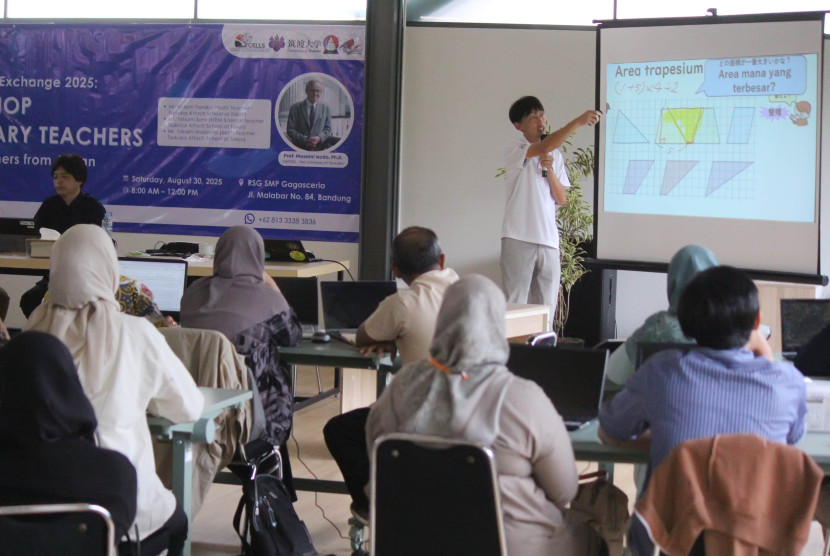 Sensei Takasi Marimoto menyampaikan materi saat ASEAN Practice Exchange Open Lesson, di Aula SMP Alfa…