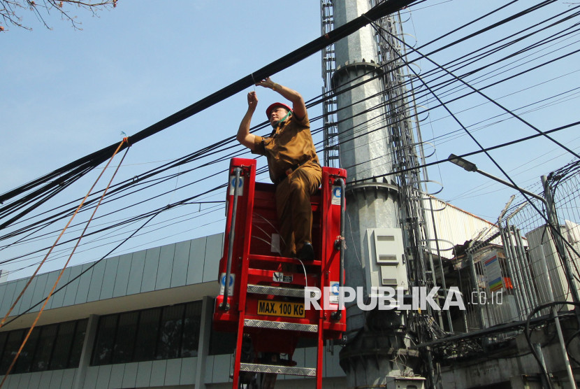 Wakil Wali Kota Bandung Erwin terjun langsung ikut merapikan kabel saat meninjau perapihan kabel telekomunikasi…