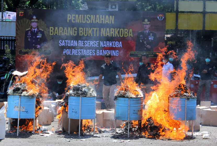 Pemusnahan narkoba dan obat-obatan tertentu (OOT) di halaman Satres Narkoba Polrestabes Bandung, Kamis (23/10/2025). Foto:…