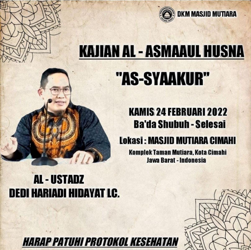 Kajian Ustadz Dedi Hariadi Hidayat membahas ‘Al-Asmaaul Husna yakni As Syaakur’ di Masjid Mutiara, Komplek…