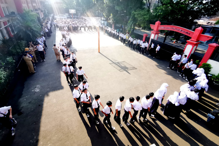Ratusan civitas akademika SMPN 7 Bandung mengikuti kegiatan halal bihalal di lapangan basket sekolah pada…