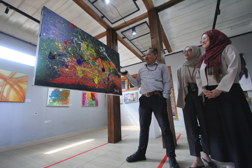 Seniman Dede Priana menjelaskan lukisannya kepada pengunjung di Galeri Lorong Senja, Cijagra, Kota Bandung, Selasa…