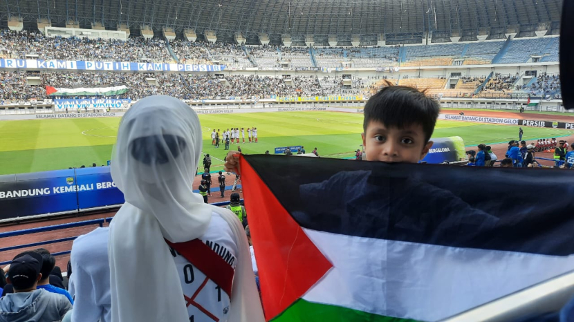 Salah seorang bobotoh cilik mengibarkan bendera PalestinaBANDUNG--- Ribuan penonton laga Persib Bandung kontra Arema FC…