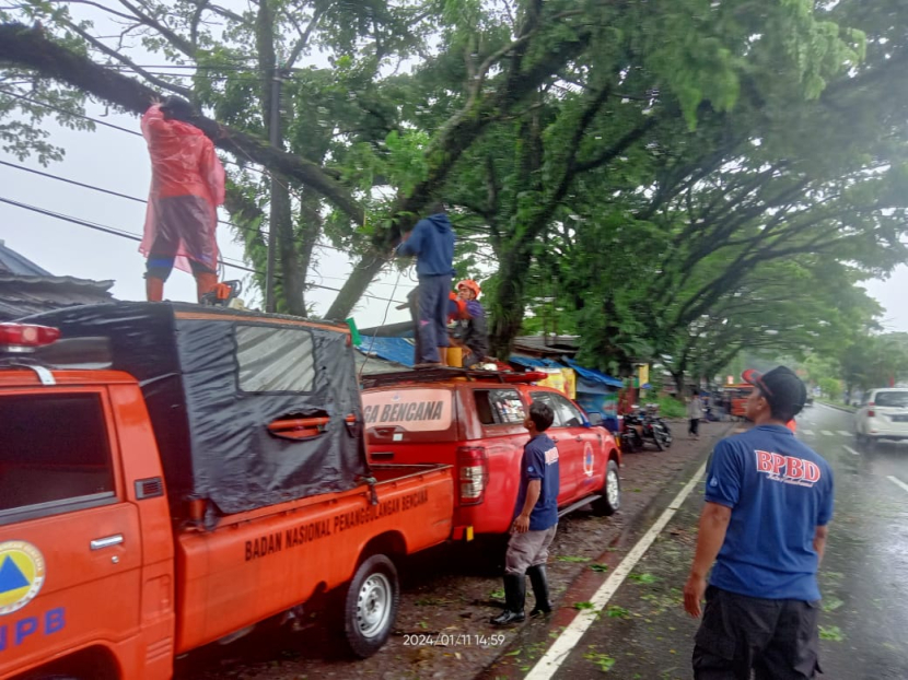 Pohon tumbang juga terjadi di Jalur Lingkar Selatan, jenis pohon Trambes petugas memotong dahan yang…