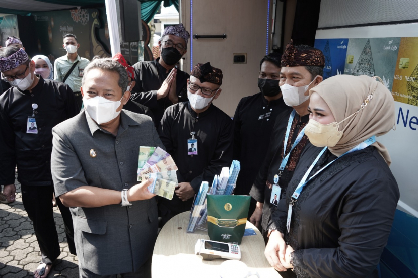 Plt Wali Kota Bandung Yana Mulyana dan Kapala Cabang Perwakilan BI Jabar, Herawanto menunjukkan uang…