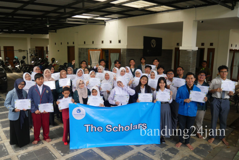 Para penerima beasiswa SDF berfoto bersama di Sekretariat SDF, Dago, Kota Bandung, Sabtu (7/9/2025). Foto:…