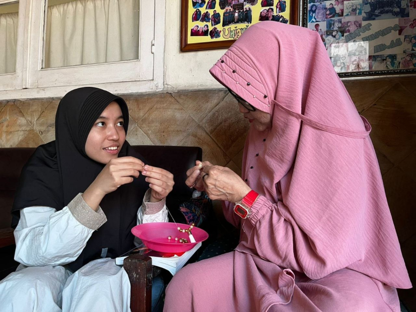 Siswi SMA Berasrama Darul Hikam meronce bersama nenek yang tinggal di Panti Wreda.BANDUNG---Untuk mengisi bulan…