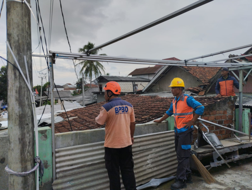 Petugas BPBD lakukan evakuasi rumah yang terkena angin puting beliungSUKABUMI--Bencana angin puting beliung menerjang Kecamatan…