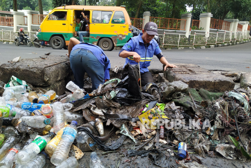 Petugas kebersihan berupaya mengangkat sampah yang memenuhi drainase di Jalan Stiabudi, Kota Bandungm. Foto: Edi…